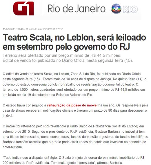 O edital de venda do teatro Scala, no Leblon, Zona Sul do Rio, foi publicado no Diário Oficial nesta segunda-feira (15) . Foram mais de 10 anos de disputa na Justiça. Na quinta-feira (11), o governo do estado conseguiu concluir o trabalho de regularização documental do teatro. O terreno de 1.500 metros quadrados será ofertado por um preço mínimo de R$ 44,5 milhões em um leilão no dia 19 de setembro na Bolsa de Valores do Rio.