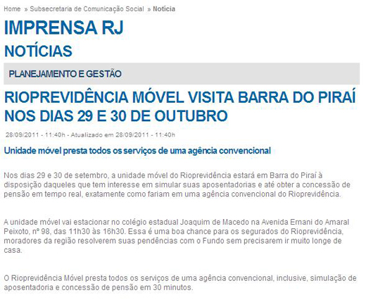 Nos dias 29 e 30 de setembro, a unidade móvel do Rioprevidência estará em Barra do Piraí à disposição daqueles que tem interesse em simular suas aposentadorias e até obter a concessão de pensão em tempo real, exatamente como fariam em uma agência convencional do Rioprevidência.