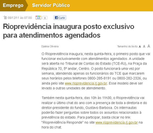 O Rioprevidência inaugura nesta quinta-feira, o primeiro posto que vai funcionar exclusivamente com atendimentos agendados. A unidade será aberta no Tribunal de Contas do Estado (TCE-RJ), na Praça da República 70, Centro. O posto funcionará uma vez por semana, atendendo apenas os funcionários do TCE que marcarem seus horários pelos telefones 0800-285-8191 ou 0800-282-2326, ou ainda pelo site www.rioprevidencia.rj.gov.br. Este modelo deve ser levado a outras unidades de atendimento.