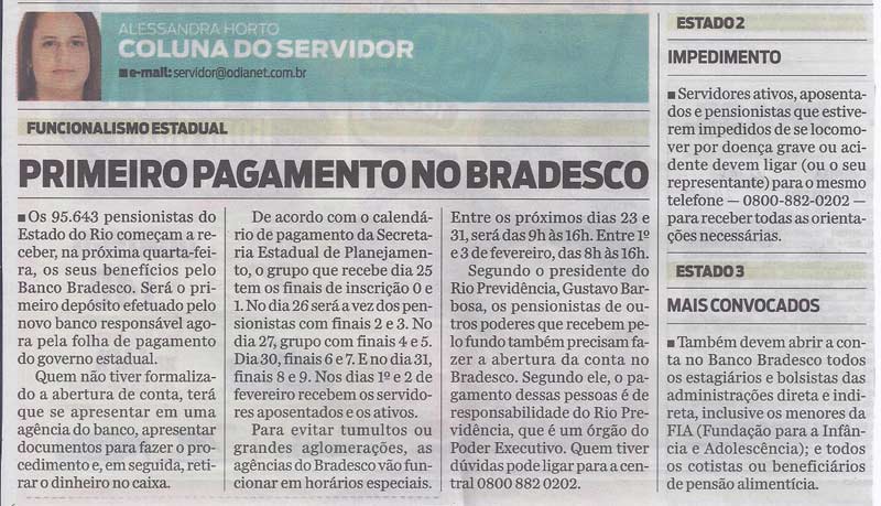 Segundo o presidente do Rio Previdência, Gustavo Barbosa, os pensionistas de outros poderes que recebem pelo fundo também precisam fazer a abertura da conta no Bradesco. Segundo ele, o pagamento dessas pessoas é de responsabilidade do Rio Previdência, que é um órgão do Poder Executivo. Quem tiver dúvidas pode ligar para a central 0800 882 0202.
