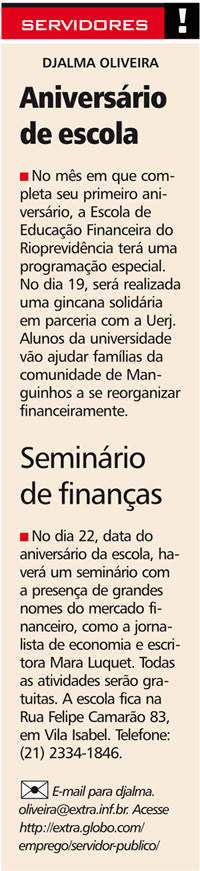 No mês em que completa seu primeiro aniversário, a Escola de Educação Financeira do Rioprevidência terá uma programação especial. No dia 19, será realizada uma gincana solidária em parceria com a Uerj. Alunos da universidade vão ajudar famílias da comunidade de Manguinhos a se organizar financeiramente.