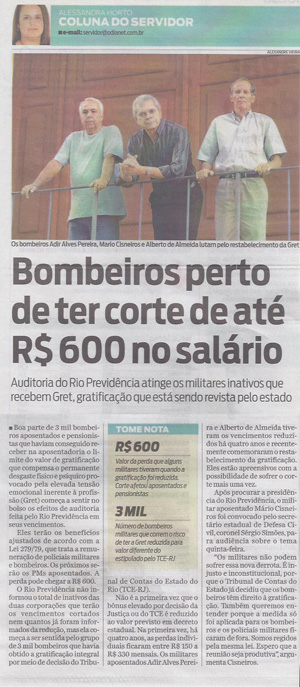 Boa parte de 3 mil bombeiros aposentados e pensionistas que haviam conseguido receber na aposentadoria o limite do valor de gratificação que compensa o permanente desgaste físico e psíquico provocado pela elevada tensão emocional inerente à profissão (Gret) começa a sentir no bolso os efeitos de auditoria feita pelo Rio Previdência em seus vencimentos.