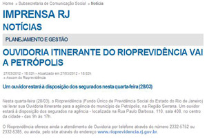 Nesta quarta-feira (28/03), o Rioprevidência (Fundo Único de Previdência Social do Estado do Rio de Janeiro) vai levar sua Ouvidoria Itinerante para a agência do município de Petrópolis, na Região Serrana. Um ouvidor estará à disposição dos segurados na agência - localizada na Rua Paulo Barbosa, 110, sala 408, no centro da cidade - das 9h às 17h.