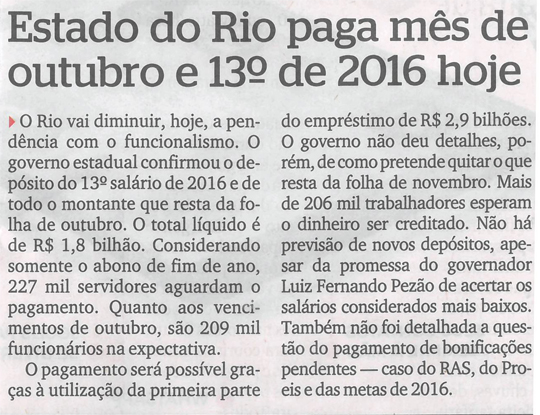 Estado do Rio paga mês de outubro e 13º de 2016 hoje