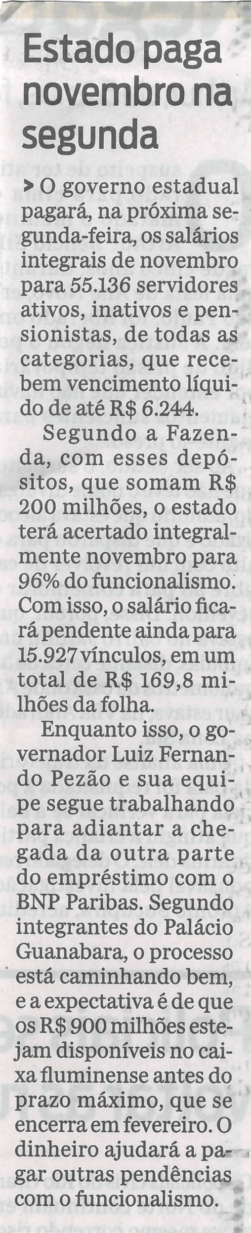 Estado paga novembro na segunda