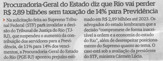 Procuradoria-Geral do Estado diz que Rio vai perder R$ 2,89 bilhões sem taxação de 14% para Previdência